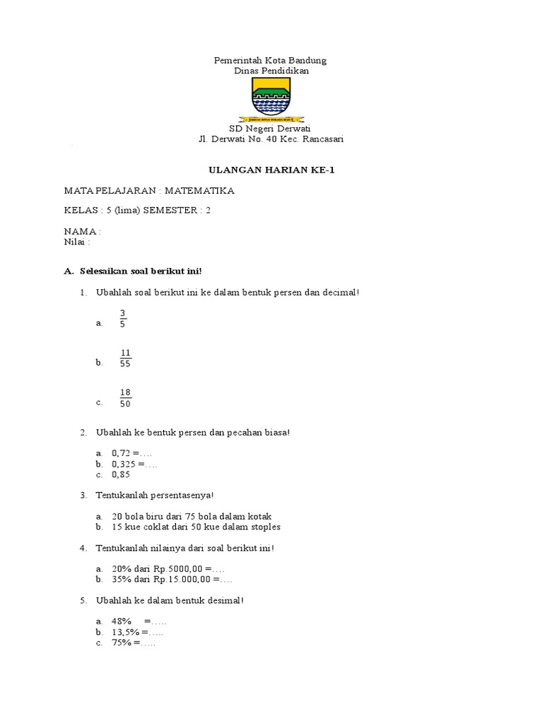Soal matematika kelas 5 semester 2 dan kunci jawaban. Akan tetapi bentuk dan contoh soal yang bisa digunakan guru untuk menilai hasil belajar siswa di kelas 5 terkait dengan materi pecahan. Walaupun terkadang masih ada perbedaan dalam implementasi jenis soal dalam kurikulum 2013 revisi 2017 ini, ada soal yang dibagikan pertema dan ada juga. We did not find results for: Soal soal ini dapat sahabat gunakan sebagai bahan belajar untuk lebih menguasai matematika tentang kelas 5.